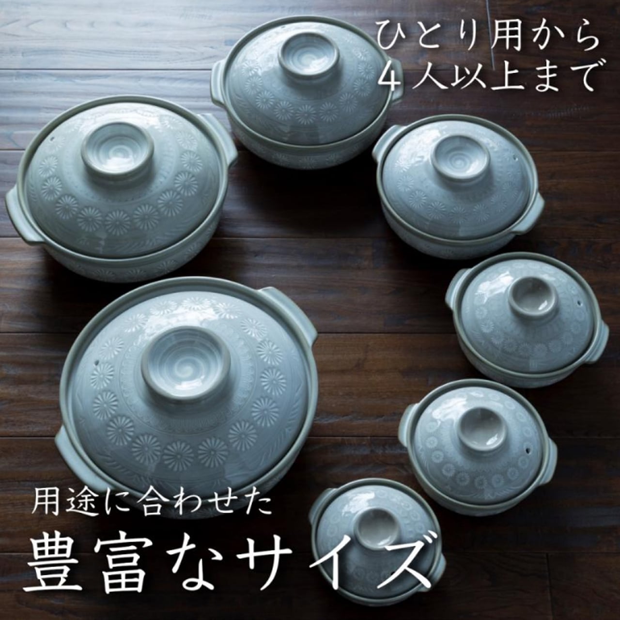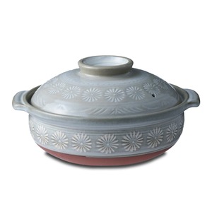 白とグレーの落ち着いたグラデーションに、大きく花の文様をあしらった日本の代表的な土鍋 花三島(Ginpo三島) シリーズは、1970年代から続くロングセラーです。